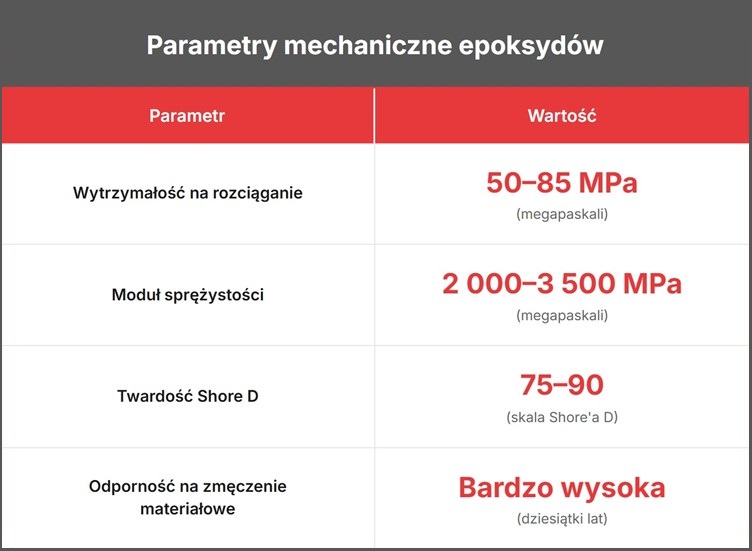 Dzięki trwałości epoksydy stosuje się w konstrukcjach narażonych na wieloletnie obciążenia – mostach, turbinach wiatrowych, kadłubach łodzi oraz elementach nośnych w budownictwie. W przeciwieństwie do klejów kontaktowych czy akrylowych, materiały epoksydowe nie tracą właściwości pod wpływem czasu czy naprężeń eksploatacyjnych.